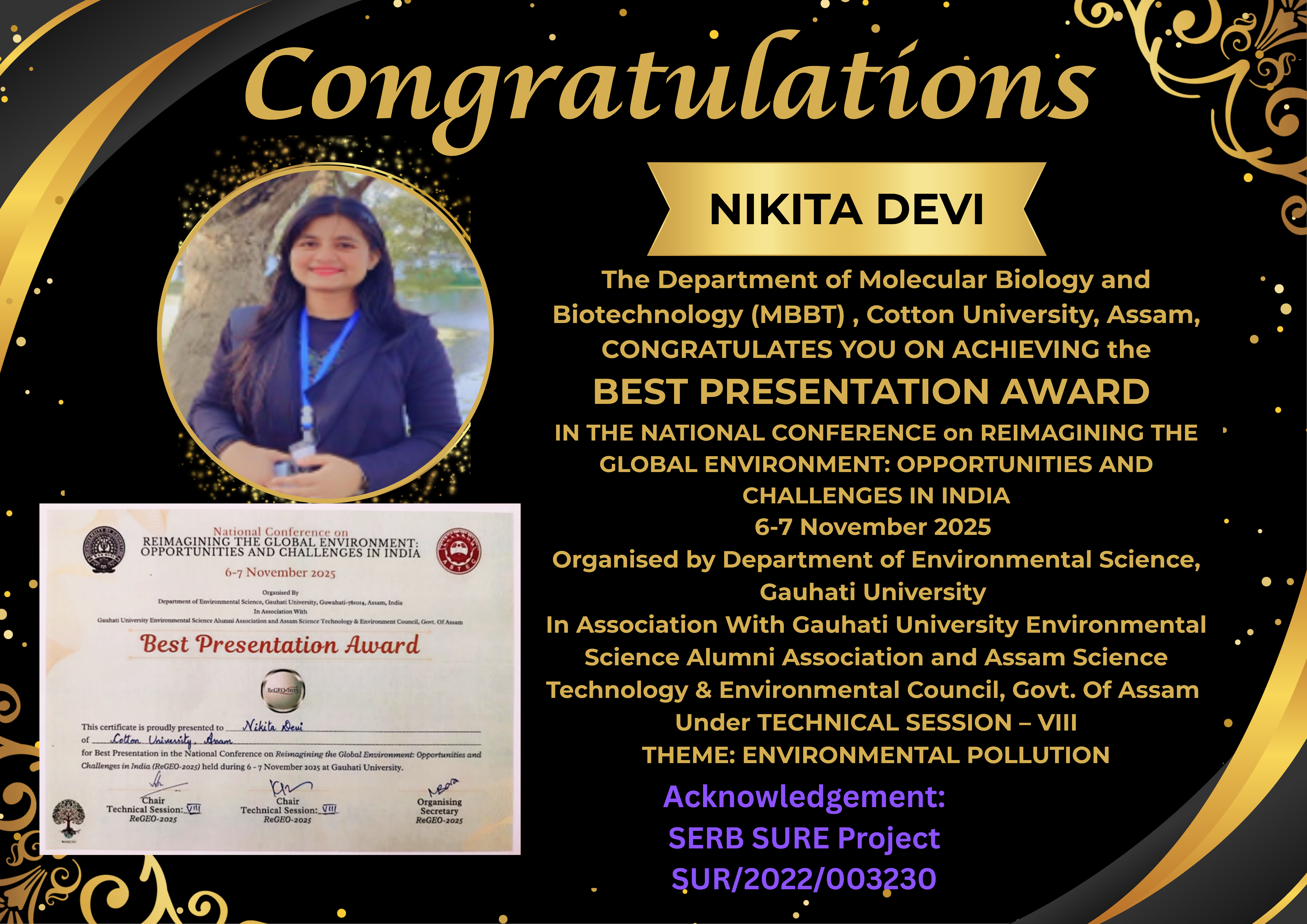 The Department of Molecular Biology & Biotechnology (MBBT) of Cotton University had its genesis as the Department of Biotechnology in the erstwhile Cotton College in 2008, offering an undergraduate, BSc in Biotechnology (Hons) programme. Subsequently, the postgraduate programme of M.Sc in Molecular Biology & Biotechnology (MBBT) was initiated in 2015. With Cotton University Act 2017, coming into force, the departments of Biotechnology and MBBT were unified as the Department of Molecular Biology & Biotechnology (MBBT) on January 1, 2018. The department currently has six permanent faculty, one scientific assistant and a few contractual staff. Currently, the department offers undergraduate, post-graduate and PhD programmes. The areas of research...